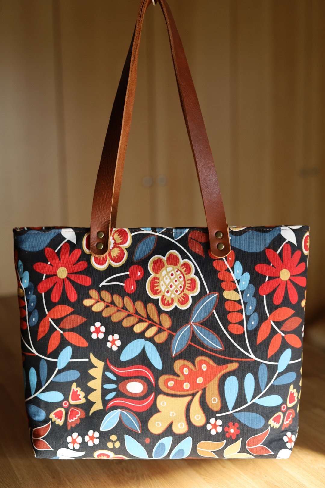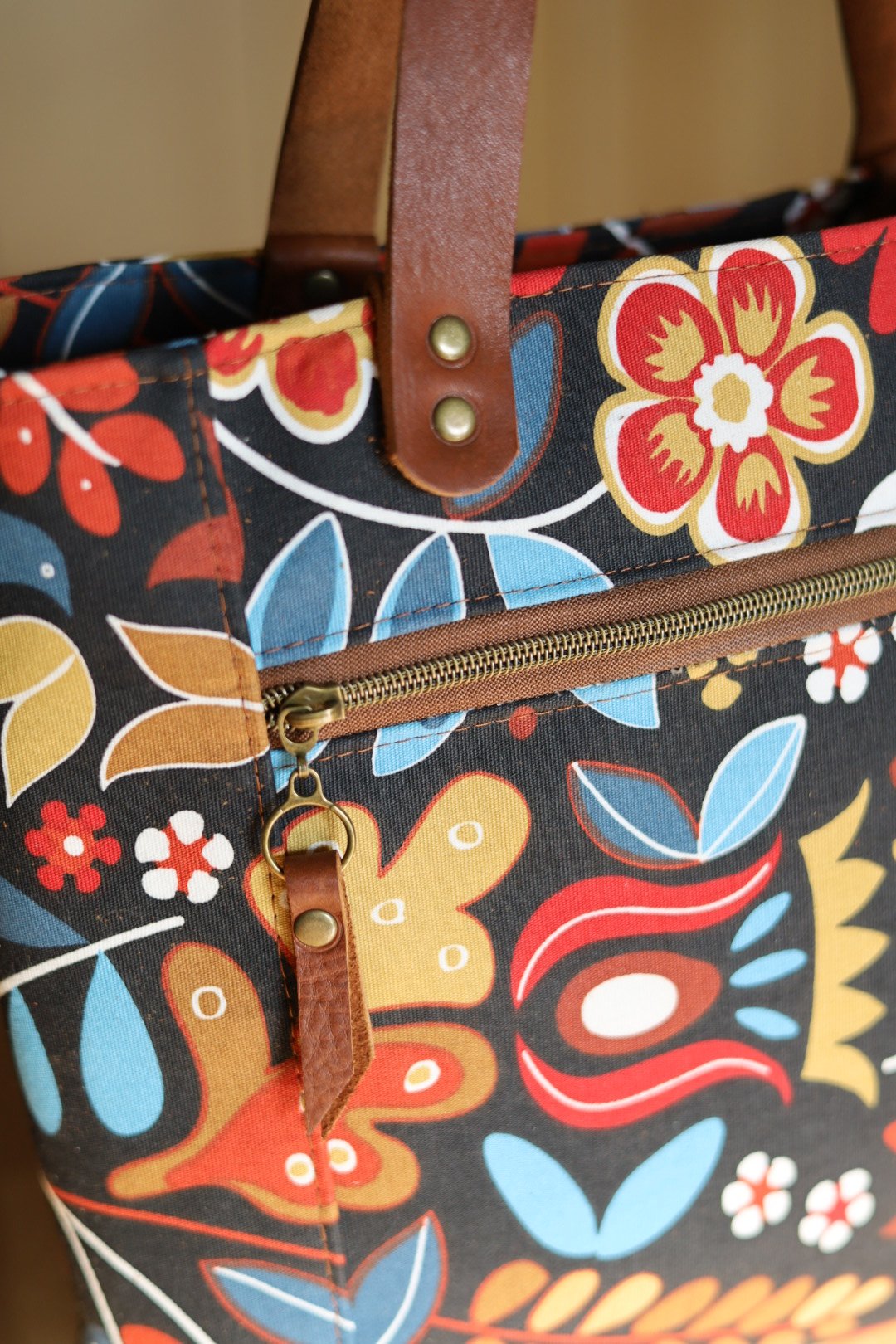 Make a statement everywhere you go. Perfect for the office, school, or a day of shopping, this tote is designed to be your go-to for everyday adventures. The eye-catching patterned exterior pairs beautifully with the warm brown lining and rich dark brown leather handles (13" drop length). Two zipper pockets keep your essentials organized, while the smooth two-way zipper closure gives you easy access on the go. Treated with a latex-based water repellent, this bag is ready to handle life’s little spills without sacrificing style. Measuring approximately 18” wide x 13.5” high x 4” deep, it offers plenty of space — and plenty of personality.