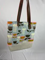 This Wool & Wax tote (pattern by @noodlehead531) features a wonderful linen fabric on the exterior that was treated with a latex-based water repellent and a fun cotton fabric on the interior. Brown leather handles complete the look.