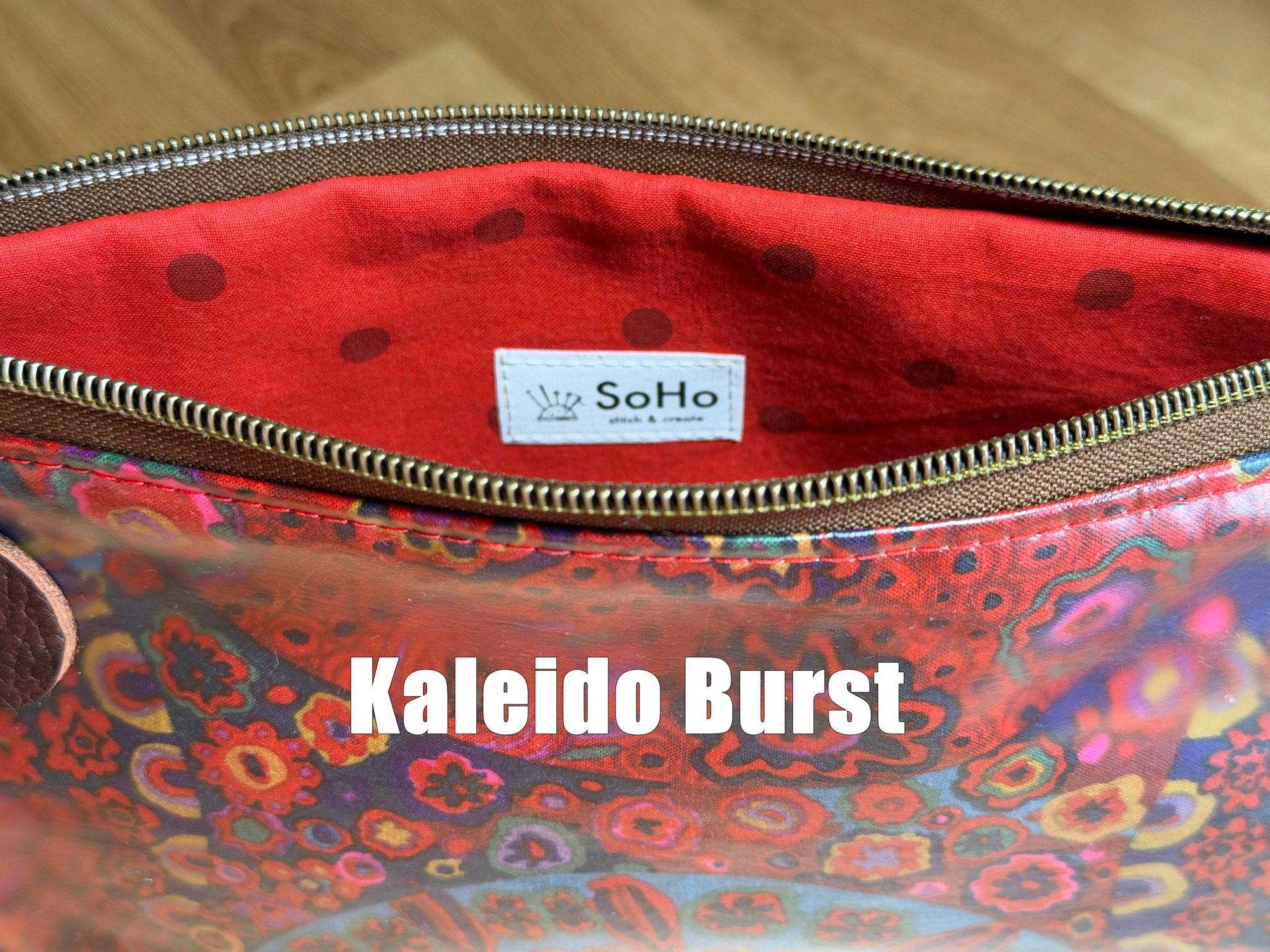 Every Sophia pouch includes a convenient leather grab strap, and the exterior is covered in clear vinyl for added protection.