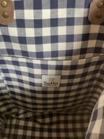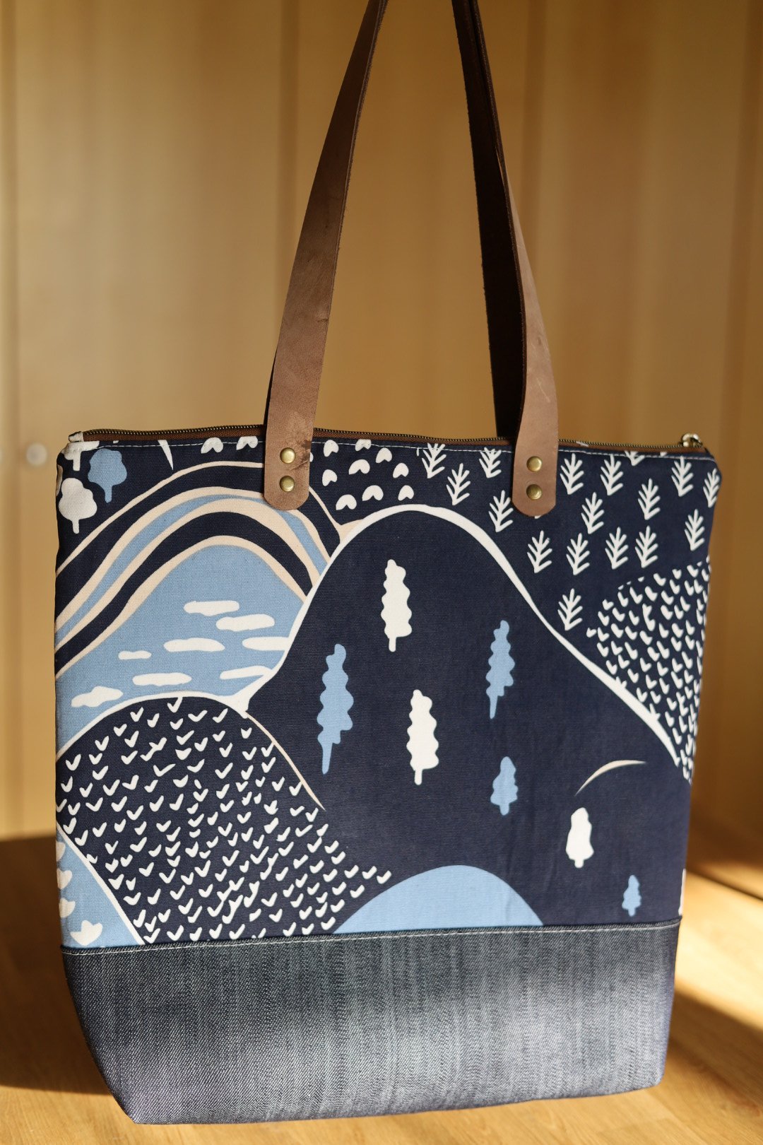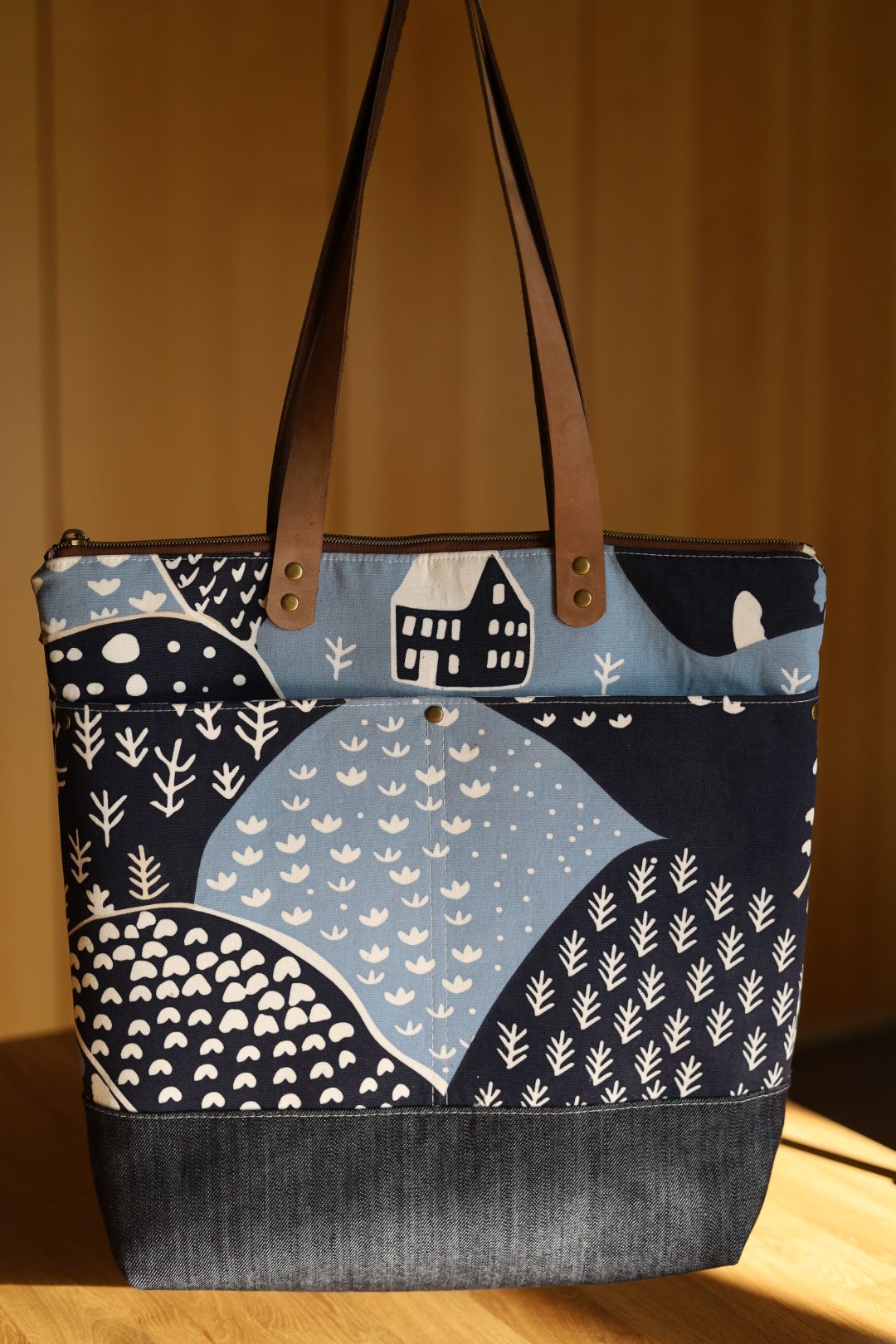 This Wool & Wax tote (pattern by @noodlehead531) combines a fairy blue house canvas with a dark denim base, both treated with a latex-based water repellent for durability and style. Inside, a coordinating checkerboard cotton lining brings a playful contrast. The brown leather handles have an 11" drop for comfortable carrying, and the tote is finished with a full zipper closure. Measuring approximately 14.5” high x 15.5” wide x 3” deep, it offers one interior slip pocket and two exterior pockets to keep everything organized.