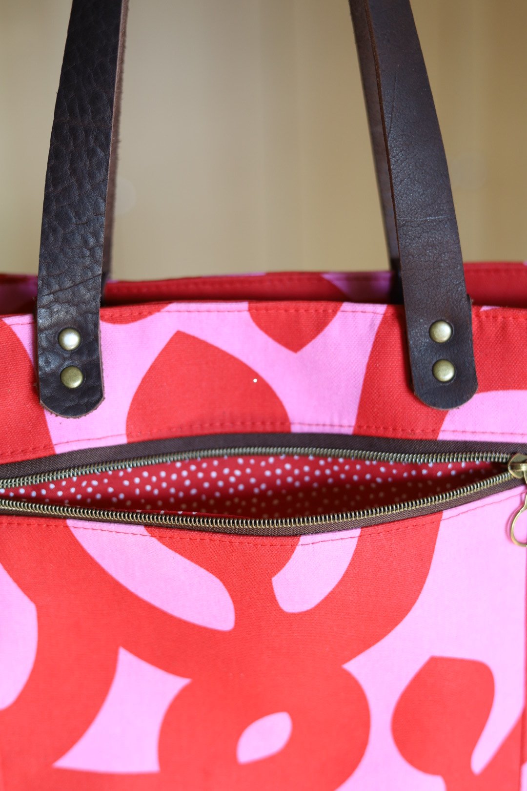 Turn heads wherever you go with this bold and playful tote! Perfect for the office, school, or a shopping day, it’s your new go-to for everyday adventures. The bright pink and hot red exterior brings all the fun, while the warm brown lining pairs beautifully with rich dark brown leather handles. Two roomy zipper pockets keep your essentials organized, and the smooth two-way zipper closure makes everything easy to grab on the go. Treated with a latex-based water repellent, this bag is built to handle life’s little spills while still looking fabulous. At approximately 18” wide x 13.5” high x 4” deep, it’s got plenty of space for everything you need — with plenty of personality too!