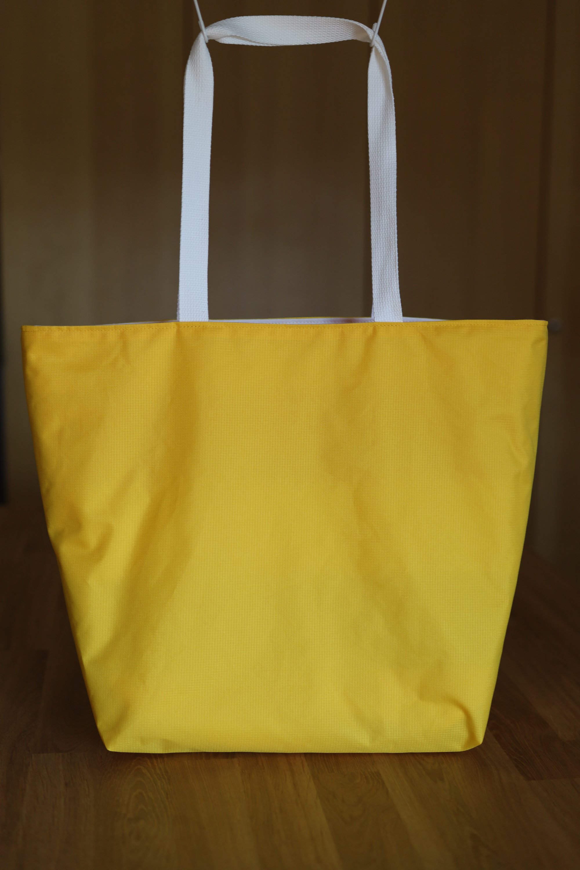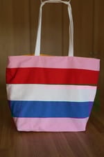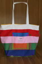 One side of the bag is a fun stripped cotton while the other side is a solid color made out of waterproof ripstop material. Bag is reversible.