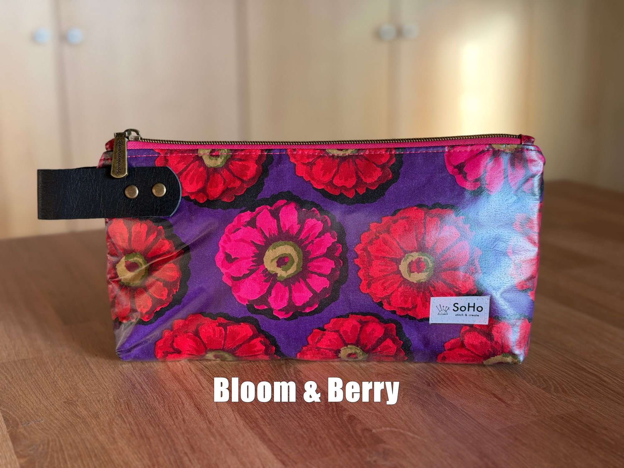 Every Sophia pouch includes a convenient leather grab strap, and the exterior is covered in clear vinyl for added protection.